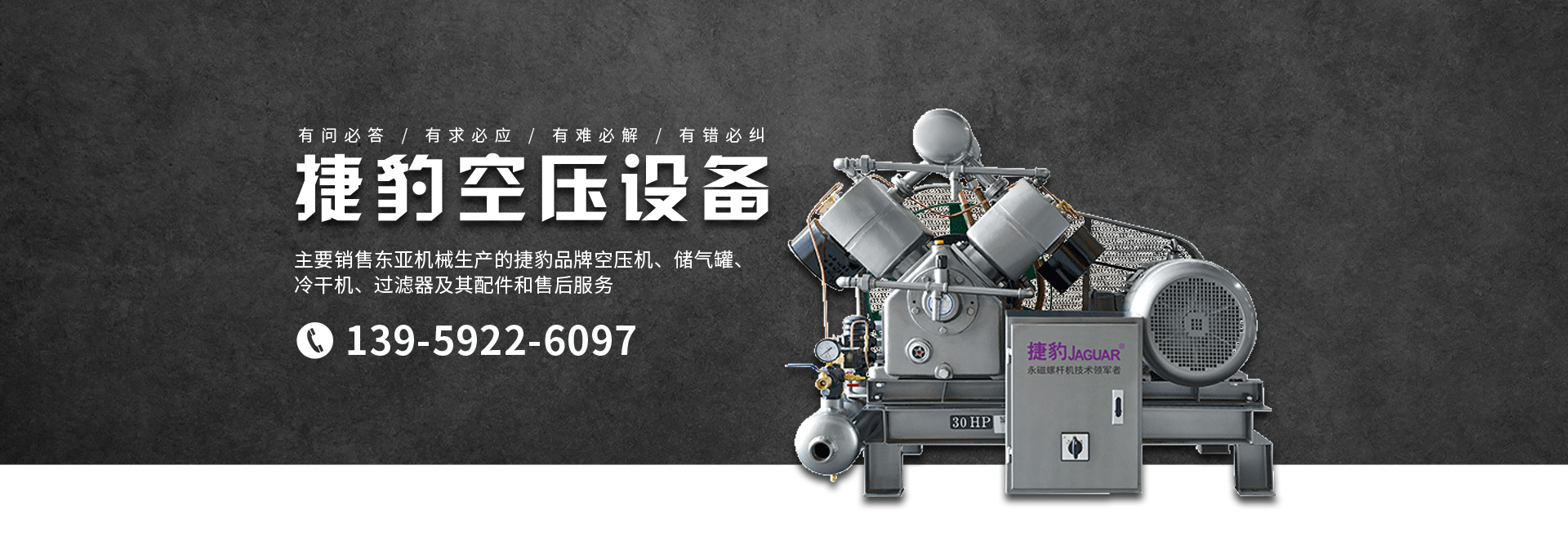 主要銷售東亞機械生產的捷豹品牌空壓機、儲氣罐、冷干機、過濾器及其配件和售后服務。